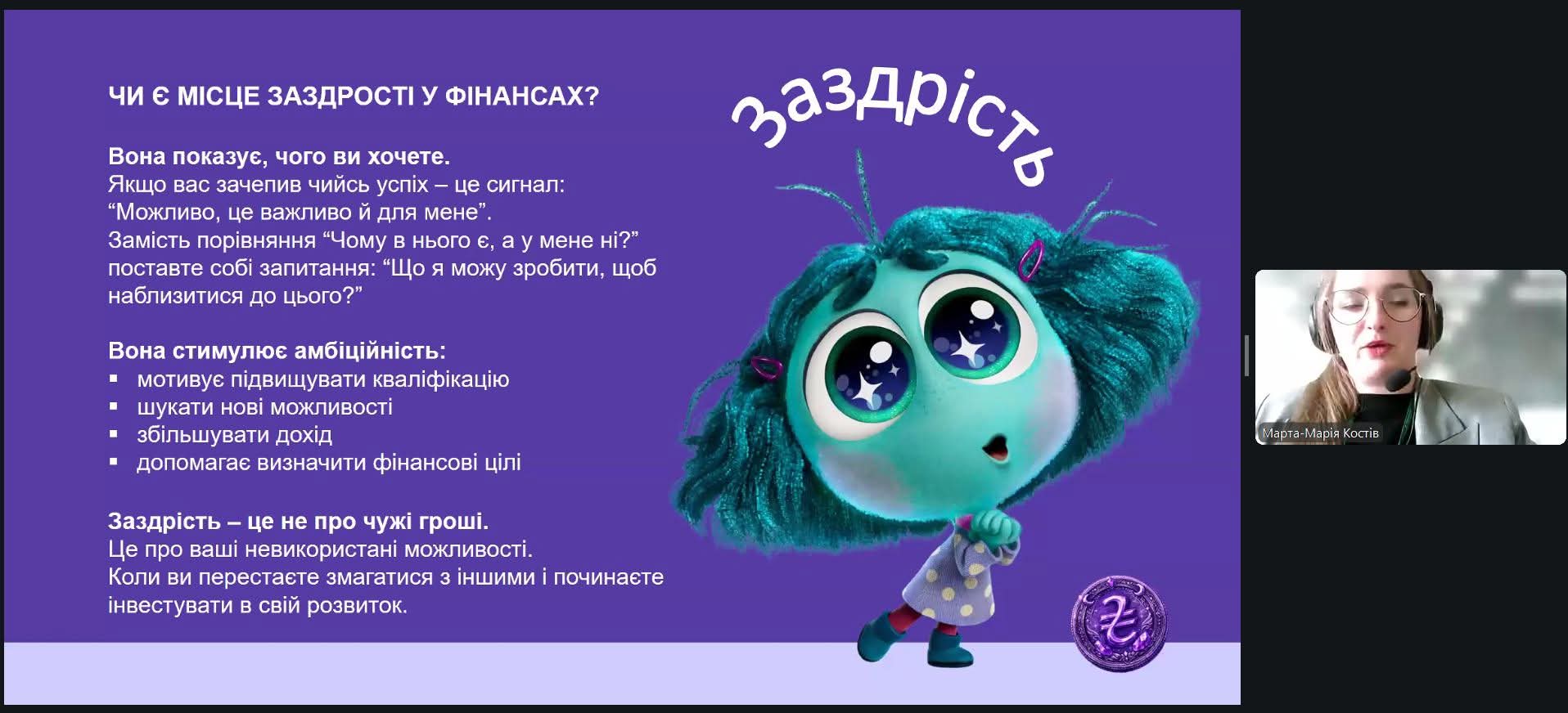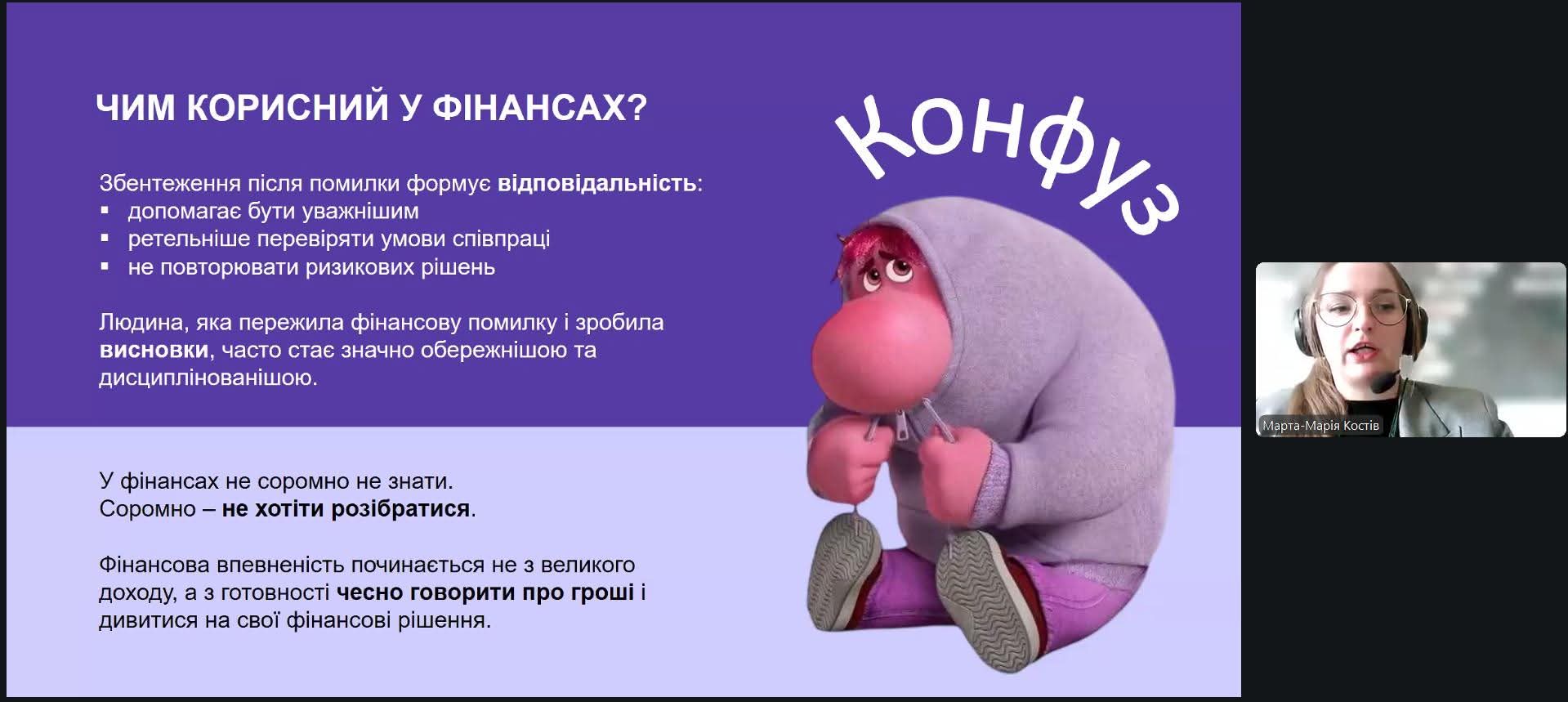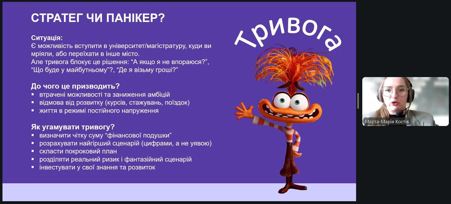 Цього разу майбутні фінансисти та бухгалтери занурилися у психологію грошей, відвідавши актуальний вебінар «Фінанси на емоціях: хто керує твоїми фінансовими рішеннями?». Спікеркою заходу стала Марта-Марія Костів, головна експертка управління зв’язків з громадськістю Департаменту комунікацій Національного банку України.