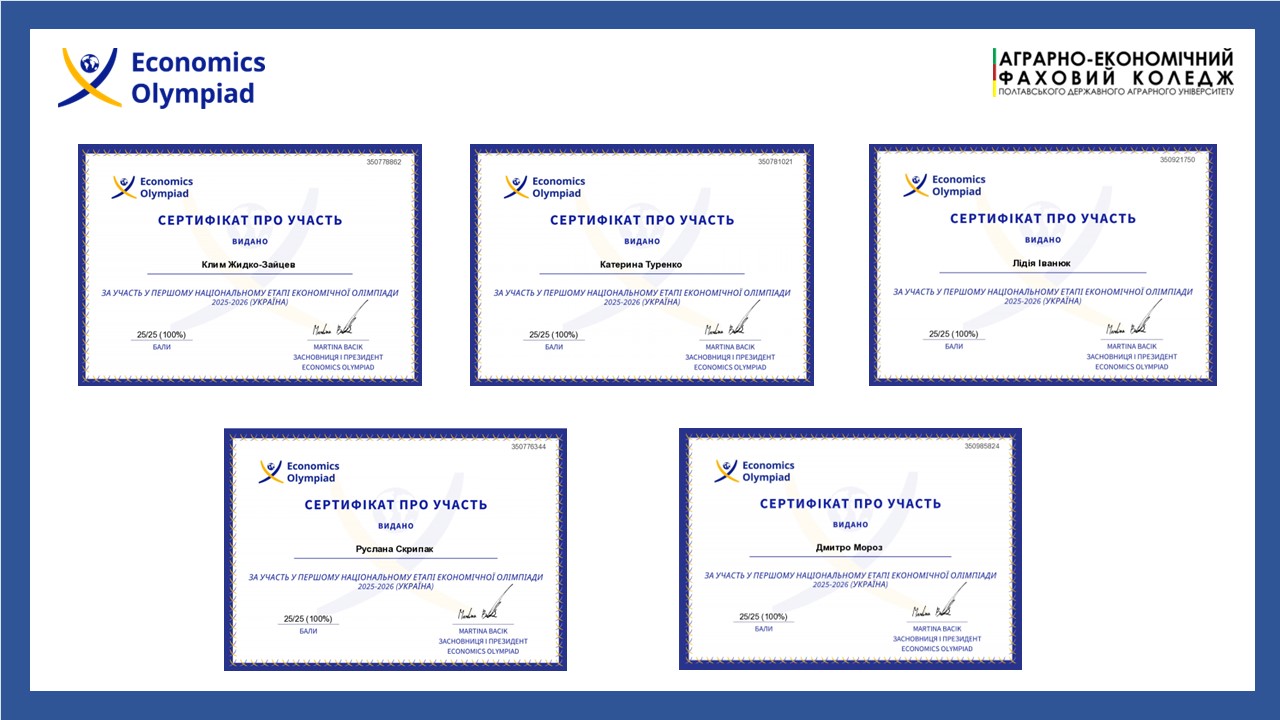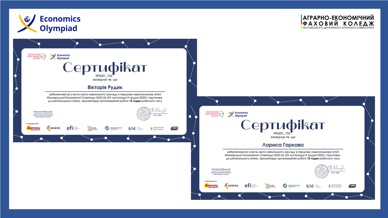 Раді повідомити, що здобувачі освіти всіх освітніх програм нашого коледжу успішно виконали завдання Національного етапу Міжнародної економічної олімпіади 2025–2026, отримавши відповідні сертифікати. За результатами відбору на регіональному етапі наш навчальний заклад представлятимуть: