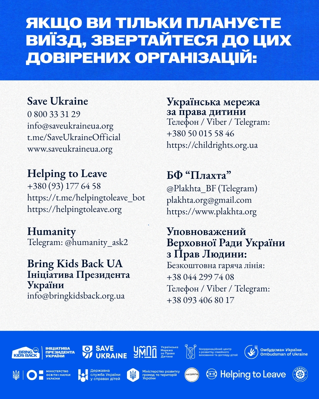 Якщо ви тільки плануєте виїзд – звертайтеся. У межах ініціативи Bring Kids Back UA допомагають виїхати безкоштовно, конфіденційно та з повним супроводом — навіть якщо немає документів. Для кожного підбирають безпечний маршрут.