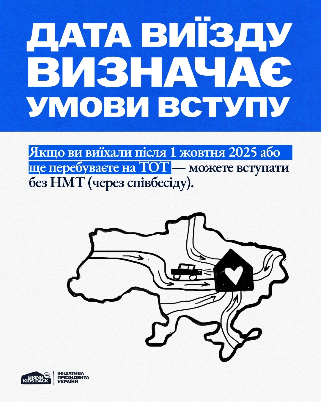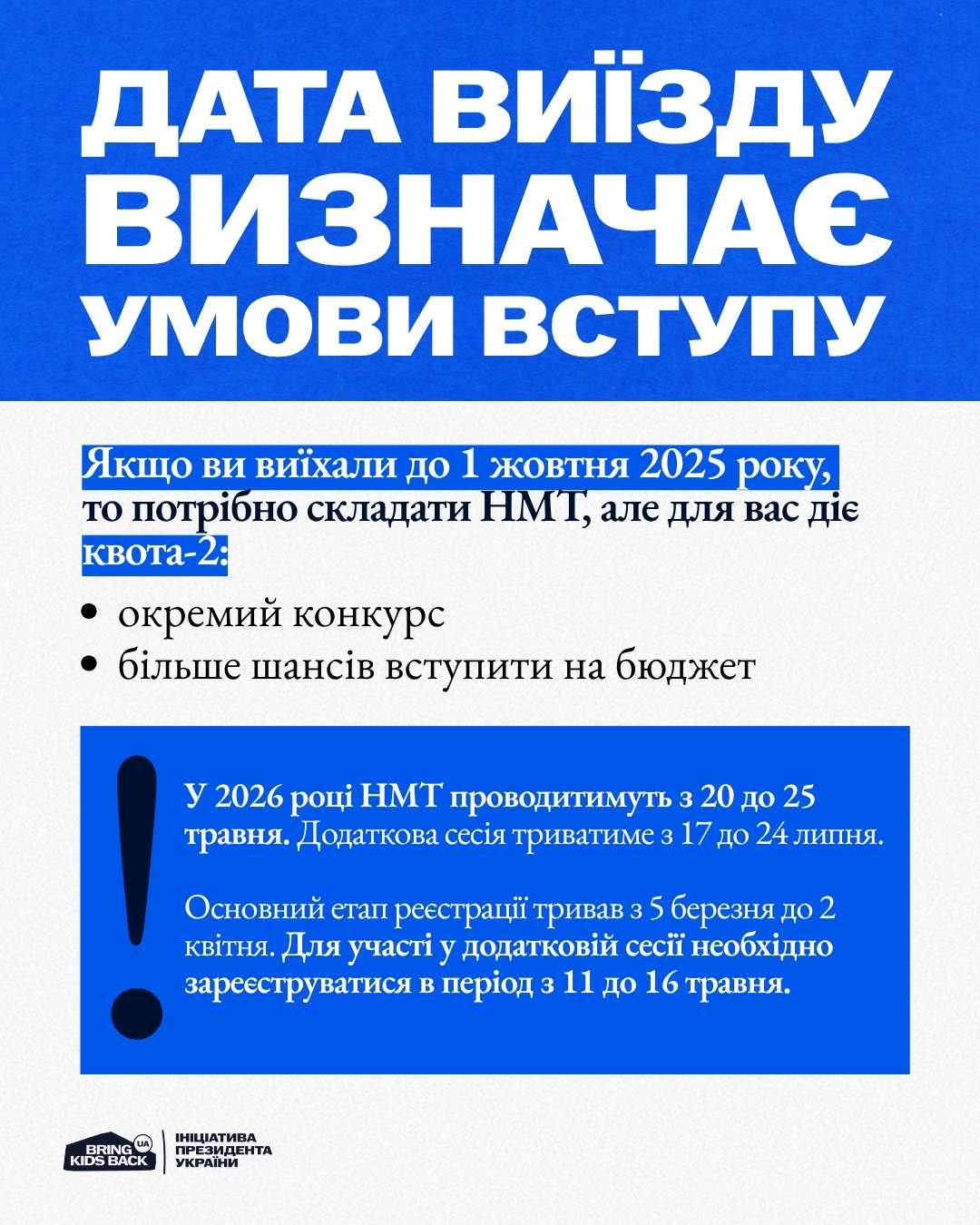 Якщо ви досі перебуваєте на ТОТ або виїхали після 1 жовтня 2025 року – вступ можливий без НМТ, через співбесіду в університеті. Якщо виїзд був раніше — потрібні результати НМТ, але діє квота-2.