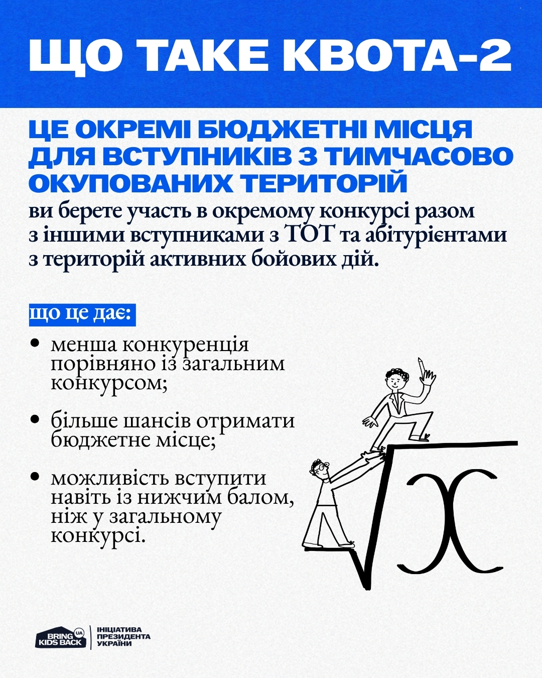Квота-2 – це окремі бюджетні місця для вступників з ТОТ і територій активних бойових дій. Вступ відбувається в окремому конкурсі, що дає більше шансів отримати бюджет. У більшості університетів це близько 10% місць, а в переміщених або прифронтових – до 40%.