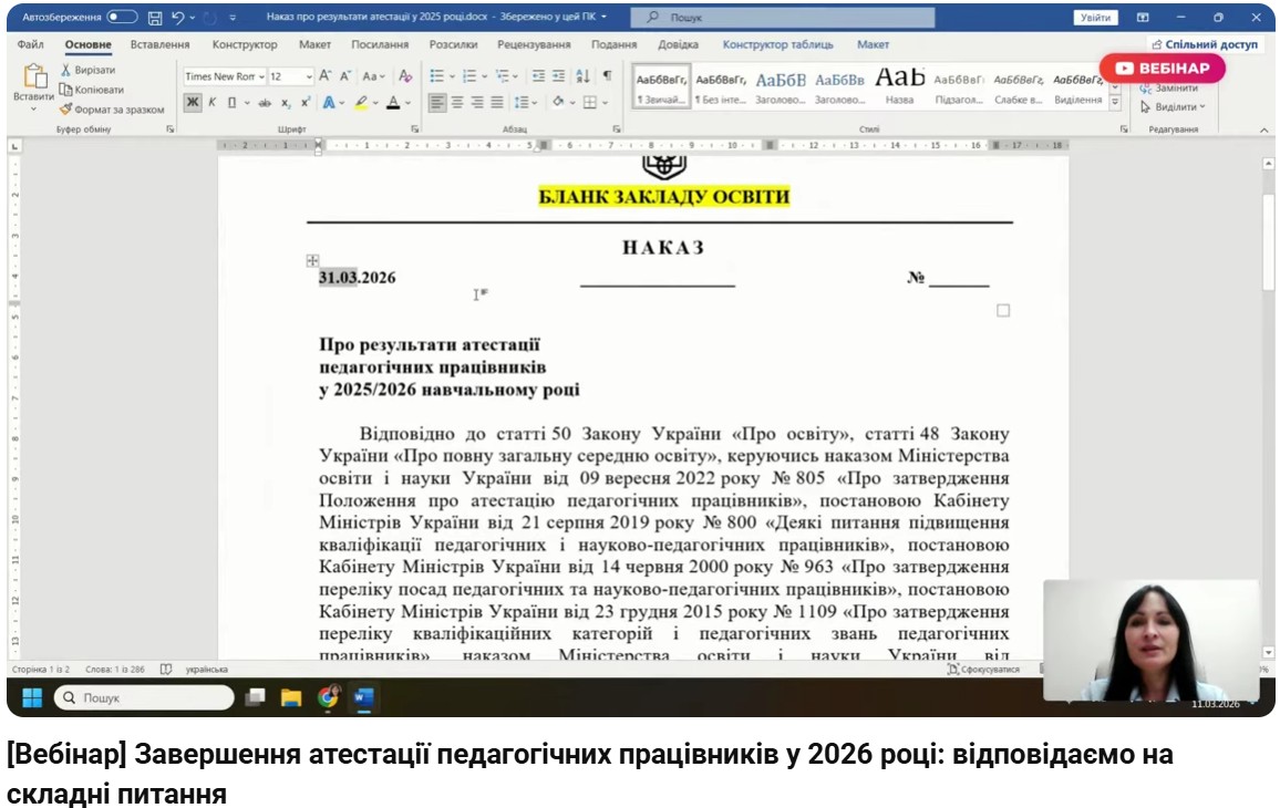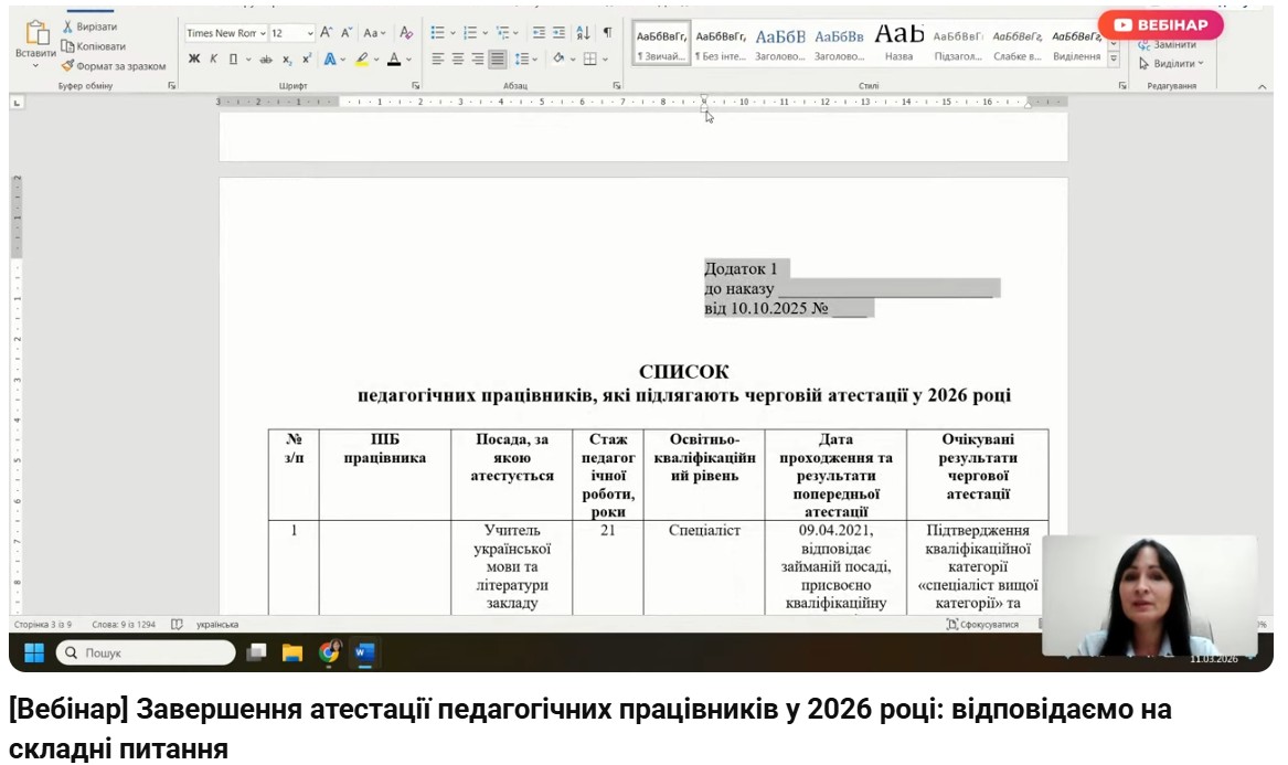 Учасники вебінару отримали практичні рекомендації щодо підготовки документів, розглянули типові помилки під час оформлення матеріалів атестації та ознайомилися з прикладами вирішення складних ситуацій, що можуть виникати в роботі атестаційних комісій. Окрему частину заходу було присвячено відповідям на запитання учасників із посиланням на норми чинного законодавства.