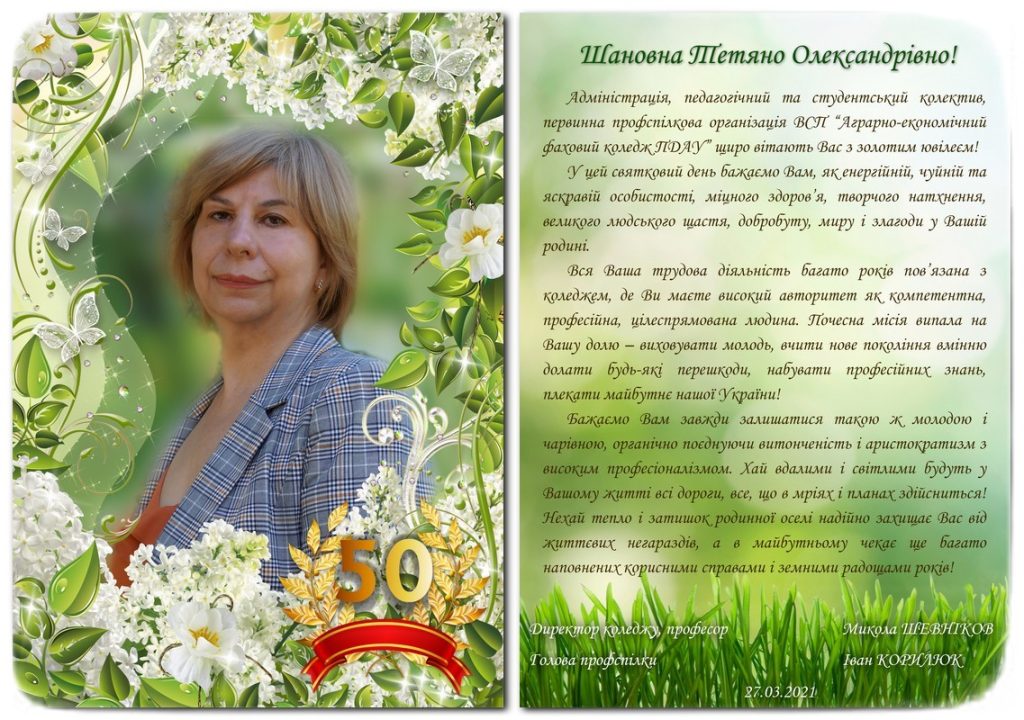 Сьогодні, 27 березня, свій День народження зустрічає заступник директора з виховної роботи нашого коледжу Шевченко Тетяна Олександрівна.